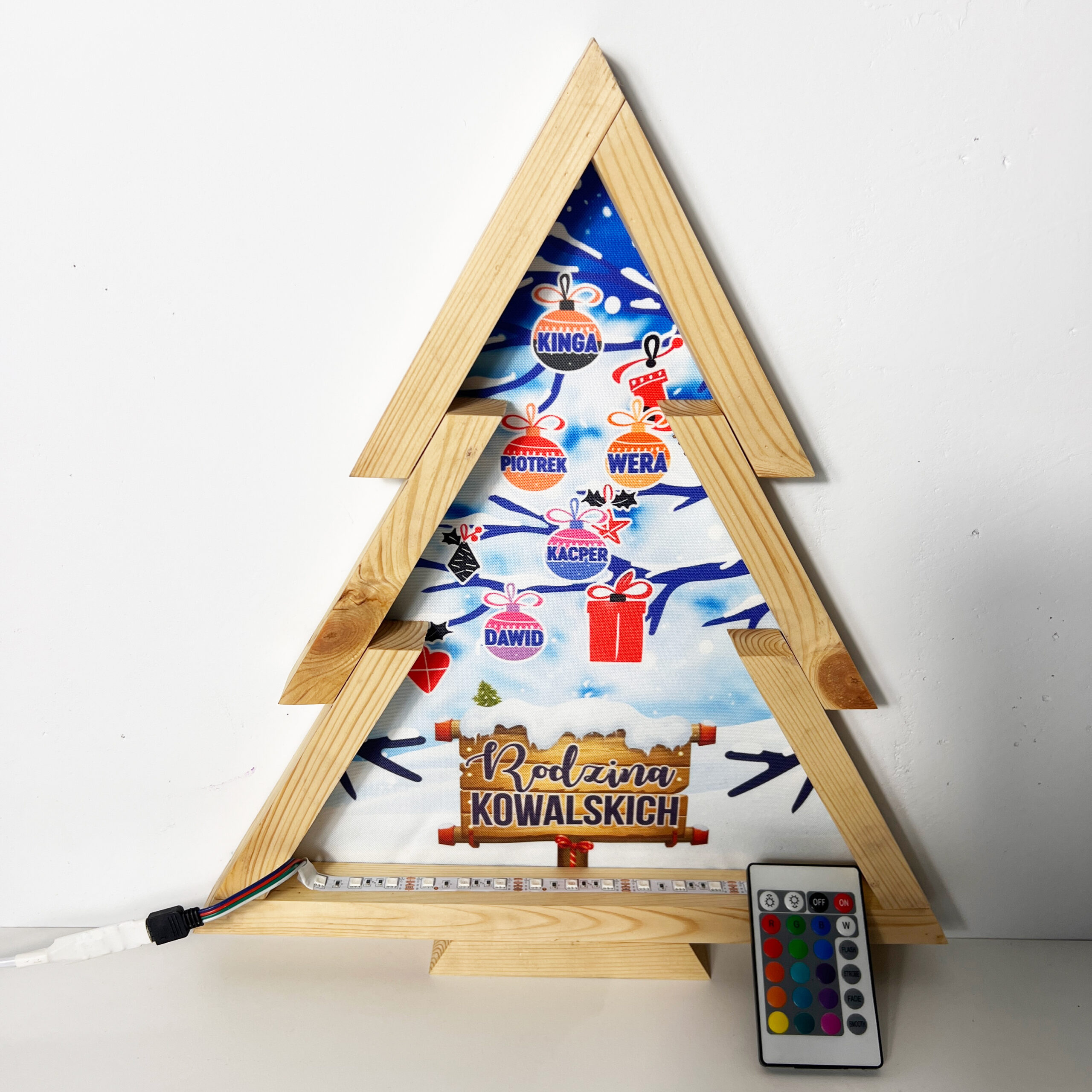Drewniana personalizowana świecąca choinka z imionami rodziny