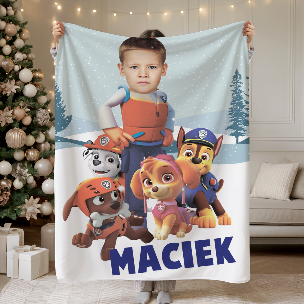 Personalizowany koc z twarzą i imieniem dziecka dla fana Psiego Patrolu