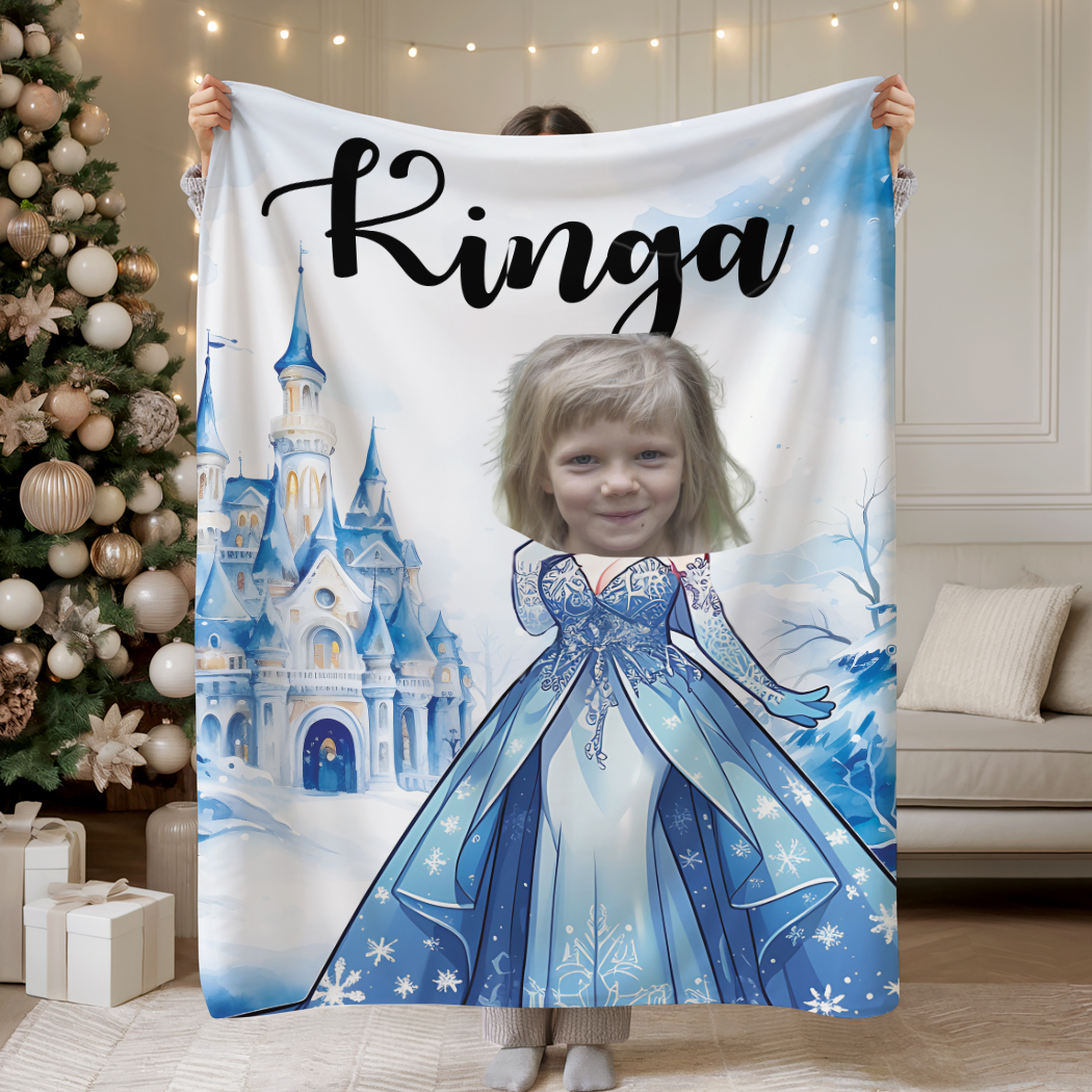 Personalizowany koc z twarzą i imieniem dziecka dla fanki księżniczek