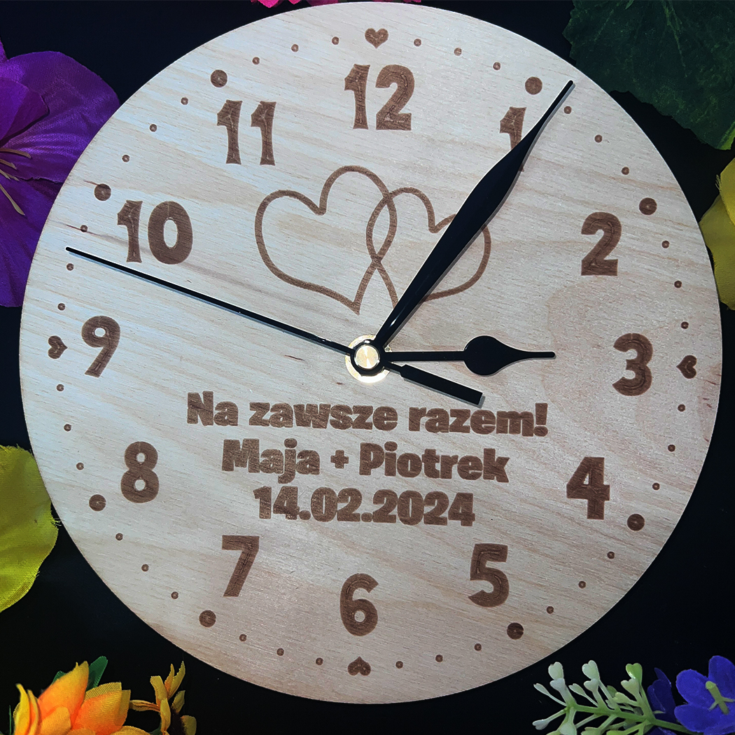 Sklejka brzozowa, z której wykonany jest zegar, zapewnia trwałość i elegancję. Zegar prezentuje się doskonale na ścianie sypialni, salonu czy biura, dodając subtelnego uroku i wyjątkowości. To nie tylko praktyczny gadżet, ale również pamiątka, która przypomina o wyjątkowych chwilach i uczuciach.