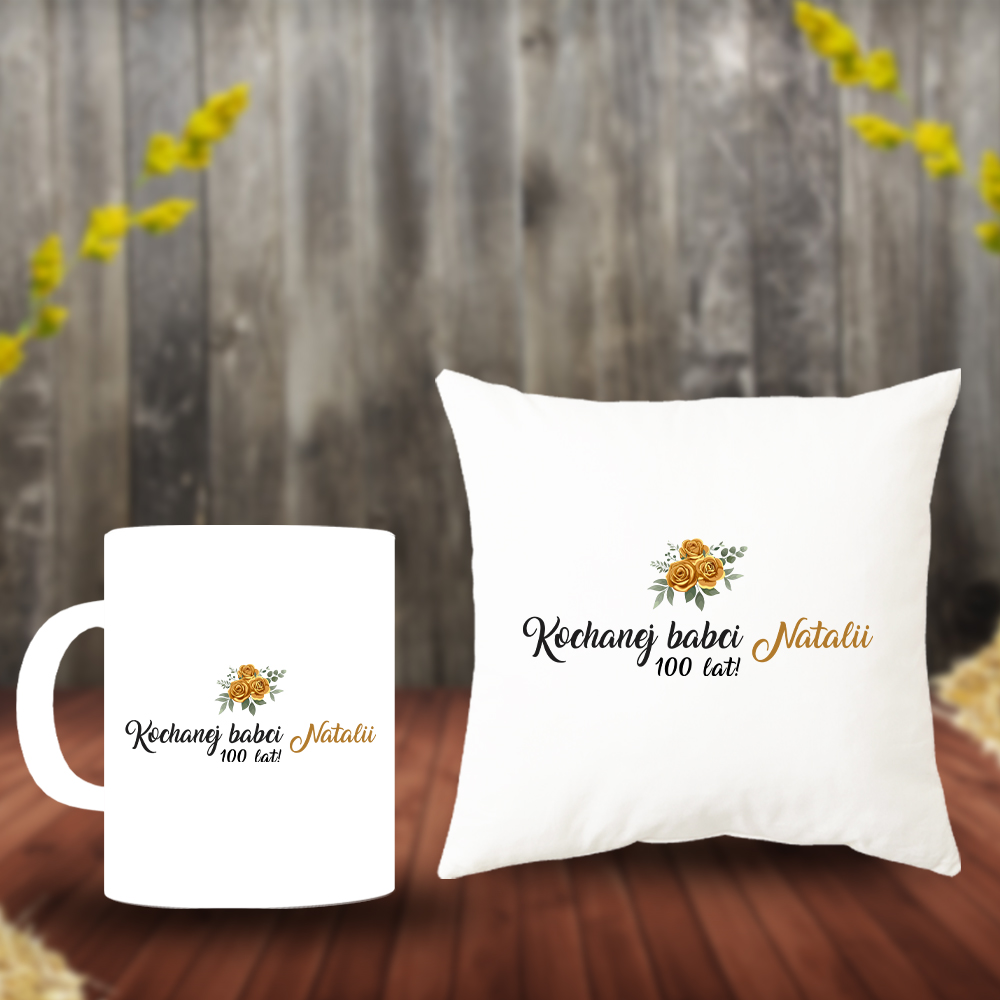 Poduszka i Kubek – Kochanej Babci [imię] 100 lat!
