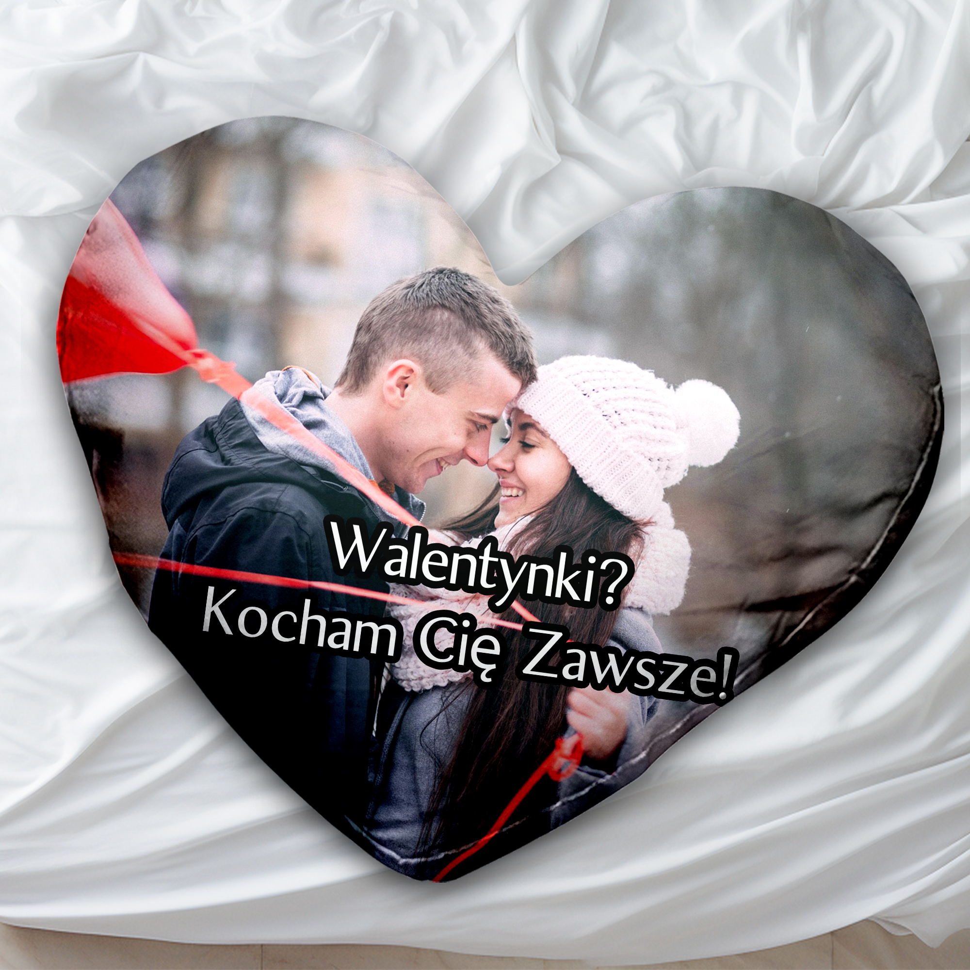 Poduszka w kształcie serca z zdjeciem i napisem na prezent
