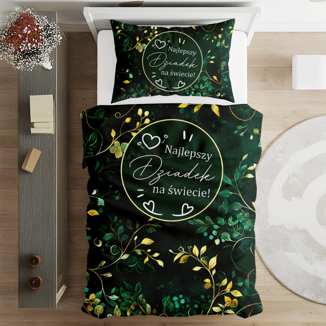 Wyjątkowa pościel stworzona z myślą o Dziadku, który zasługuje na wszystko, co najlepsze. Elegancki wzór w głębokich, zielonych odcieniach z napisem „Najlepszy Dziadek na świecie” łączy klasyczny styl z nowoczesnym designem, tworząc idealny dodatek do każdej sypialni.