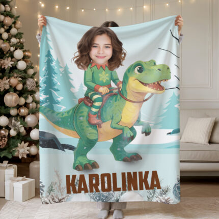 Personalizowany koc z twarzą i imieniem dziecka dla fana Dinozaurów