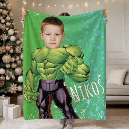 Personalizowany koc z twarzą i imieniem dziecka dla fana Hulka