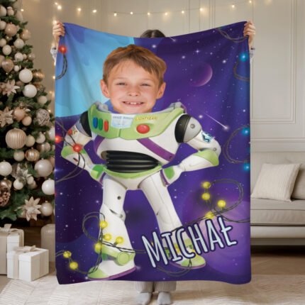 Personalizowany koc z twarzą i imieniem dziecka dla fana Buzz Astral Kosmos
