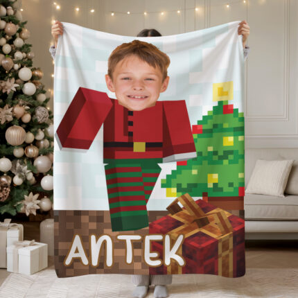 Personalizowany koc z twarzą i imieniem dziecka dla fana Minecraft