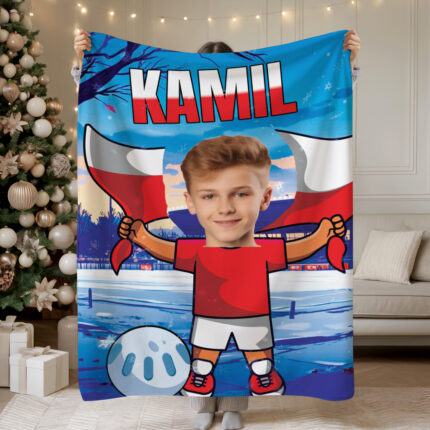 Personalizowany koc z twarzą i imieniem dziecka dla fana piłki nożnej