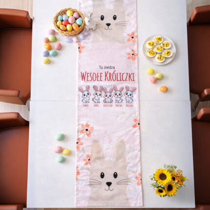 Personalizowany wielkanocny bieżnik na stół – Tu siedzą wesołe króliczki