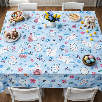 🐰 Wielkanocny obrus na stół z motywem króliczków i pisanek Dodaj swojemu stołowi wyjątkowego, wiosennego charakteru dzięki dekoracyjnemu obrusowi wielkanocnemu