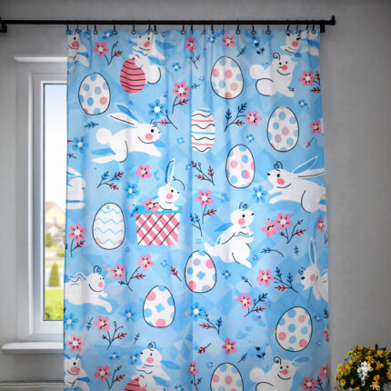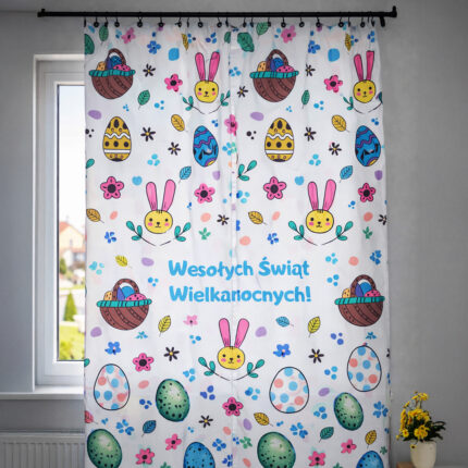 🐰 Wielkanocna zasłona dekoracyjna z motywem króliczków i pisanek Stwórz w swoim domu wyjątkowy, wiosenny klimat dzięki dekoracyjnej zasłonie wielkanocnej